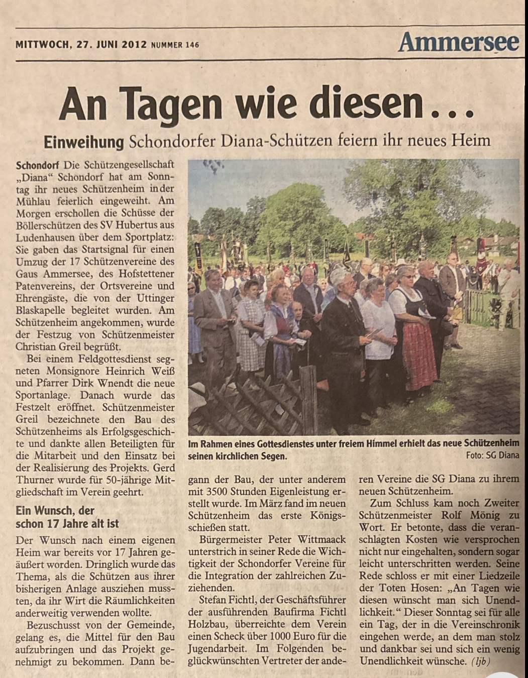 24.06.2012 Feierliche Einweihung des Schützenhauses mit den Böllerschützen Ludenhausen, Festumzug, einem ökumenischen Festgottesdienst mit Monsignore Weiß und Pfarrer Wnendt sowie Reden vom 1. Schützenmeister Christian Greil und Bürgermeister Wittmaack. Link zum Zeitungsartikel